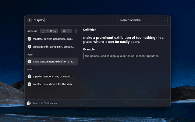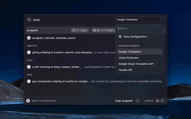 Search any word with multiple online dictionaries or translation engines in one place—lightweight, zero dependencies.
