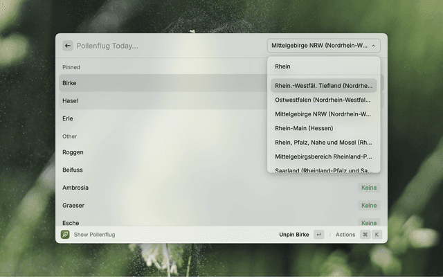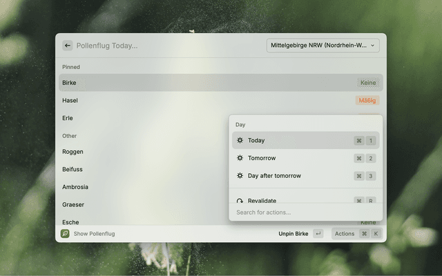 Pin allergens relevant for you, and choose from the regions provided by DWD. Using ⌘+1, ⌘+2 and ⌘+3 you can cycle through today, tomorrow and the day after.