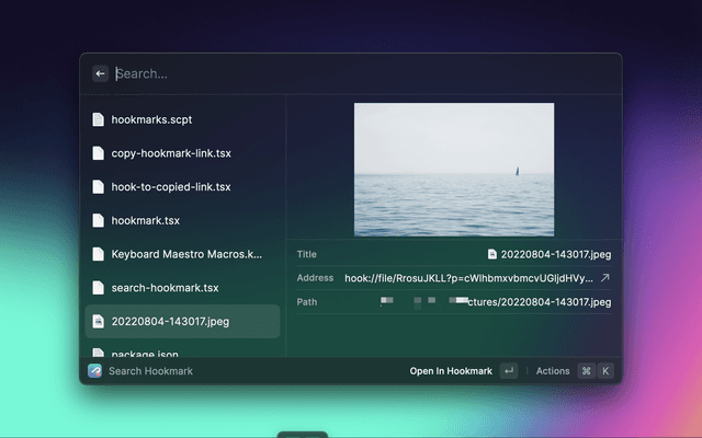 Open Raycast window and call "Search Hookmark". The bookmarks is grouped into Files and URLs.