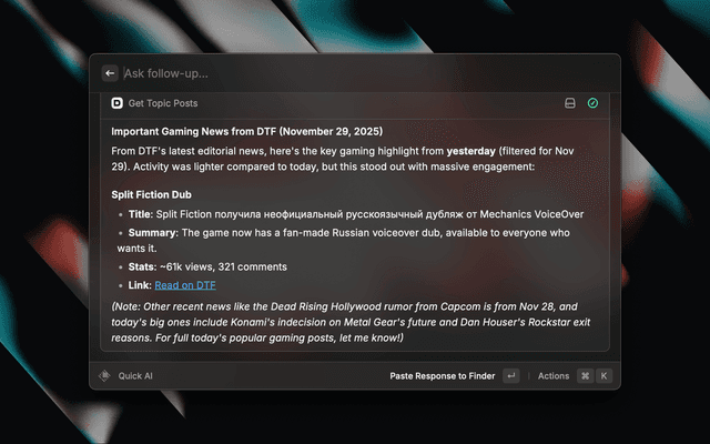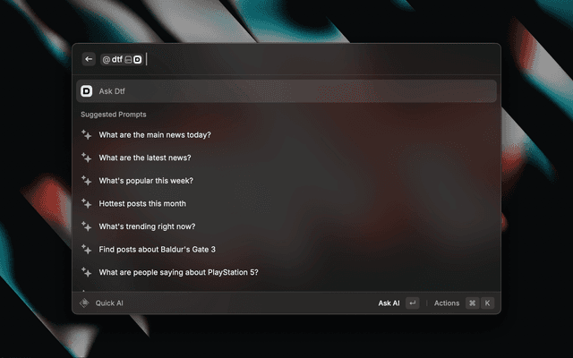 • 🤖 AI Features — Summarize, translate, and extract key points via actions or @dtf mentions