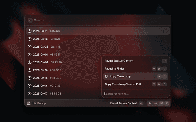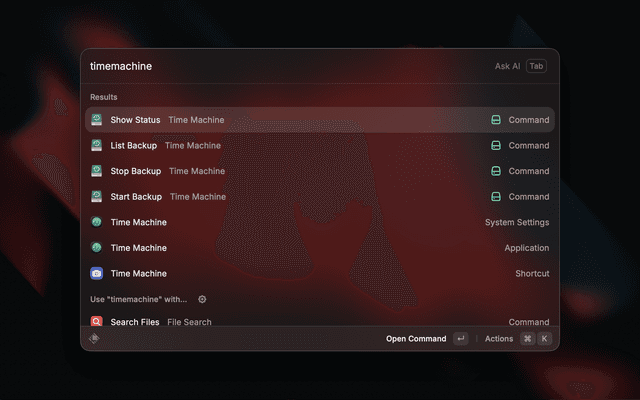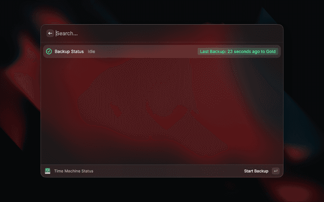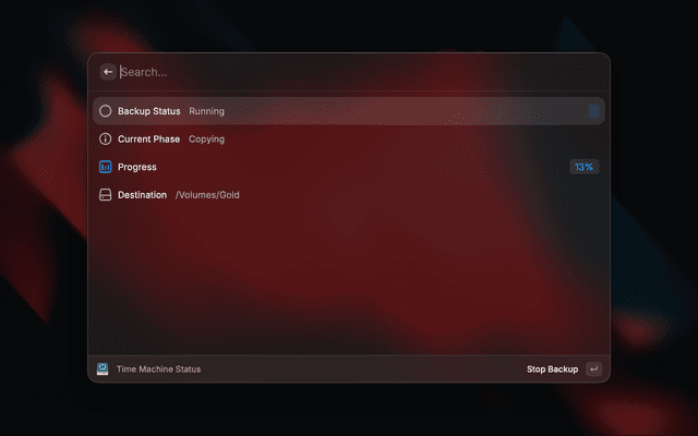 This extension is built to integrate MacOS system backup utility "TimeMachine" with Raycast. With the help of tmutil CLI Utility, it offers users the ability to control their backups with ease.