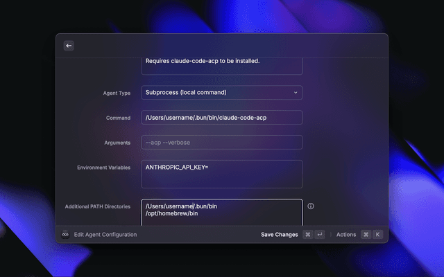 • Command: Path to the agent binary (e.g., claude-code-acp)