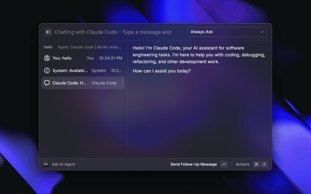 Connect to AI agents via Agent Client Protocol for coding assistance directly from Raycast.