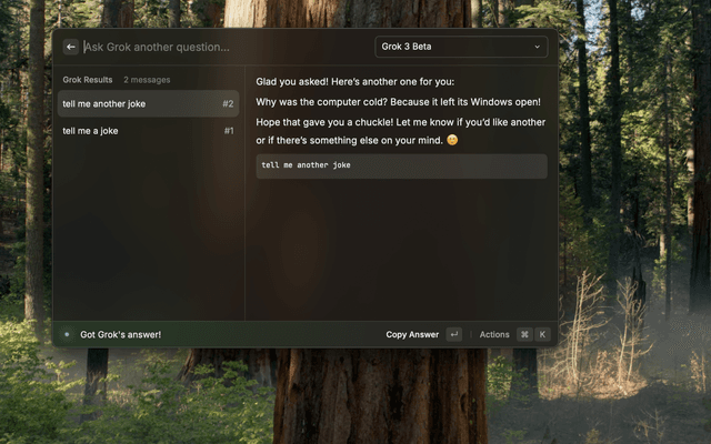 Props to the ChatGPT Raycast extension team for some of the functions and design choices / UX on here. Built with Grok.