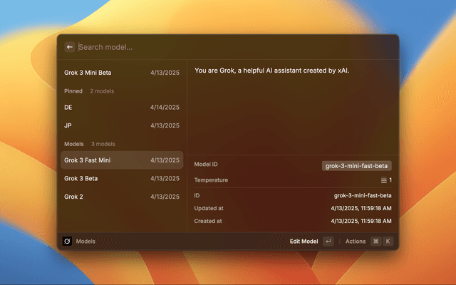 Grok AI lets you query xAI's Grok API directly from Raycast, offering a seamless way to ask questions, view conversation history, and manage custom models. Boost your productivity with AI-powered insights, all within the Raycast ecosystem.
