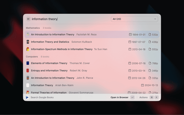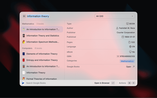 This extension works out of the box, but without an API key requests share a global quota and may be rate-limited. To avoid this, you can provide your own free Google Books API key.