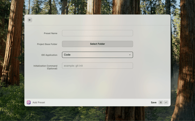 • Create Project Presets: Save your frequently used project folder locations, initialization commands and preferred IDE applications
