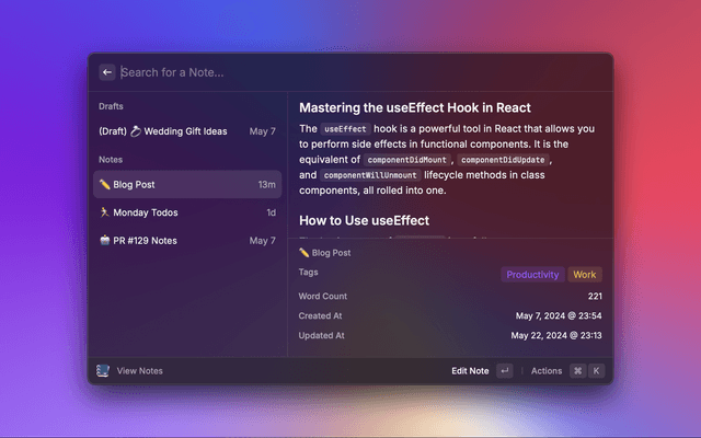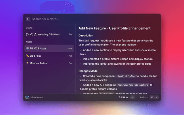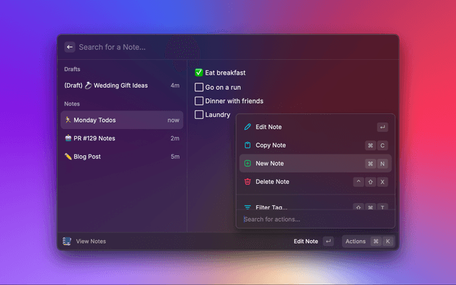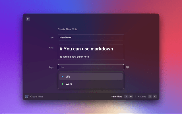 Create simple markdown notes in Raycast and sync to a folder locally. No integrations required!