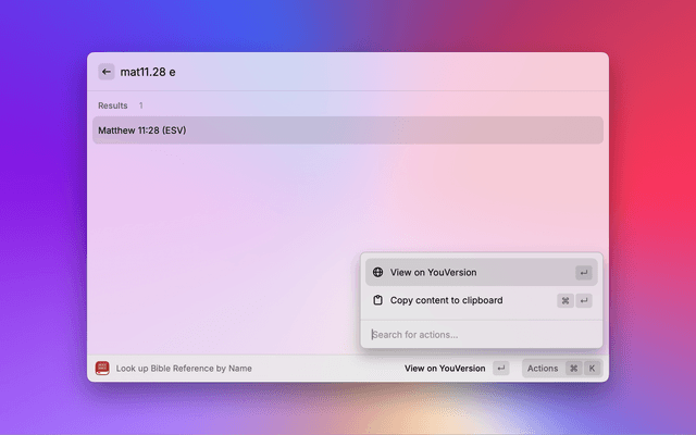 This Raycast extension allows you to search the YouVersion Bible quickly and easily. You can: