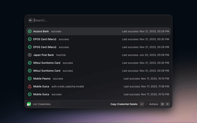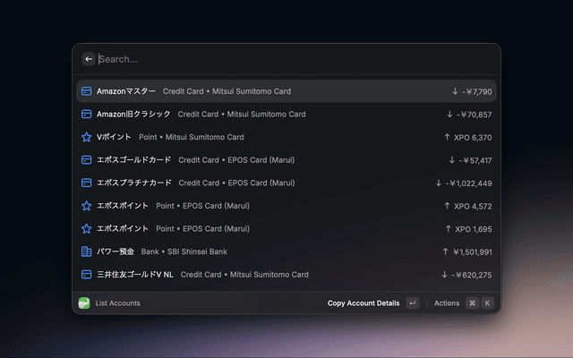 View and manage your financial data from Moneytree directly from Raycast. This extension provides quick access to your financial credentials, accounts, balances and latest transactions without leaving your workflow.