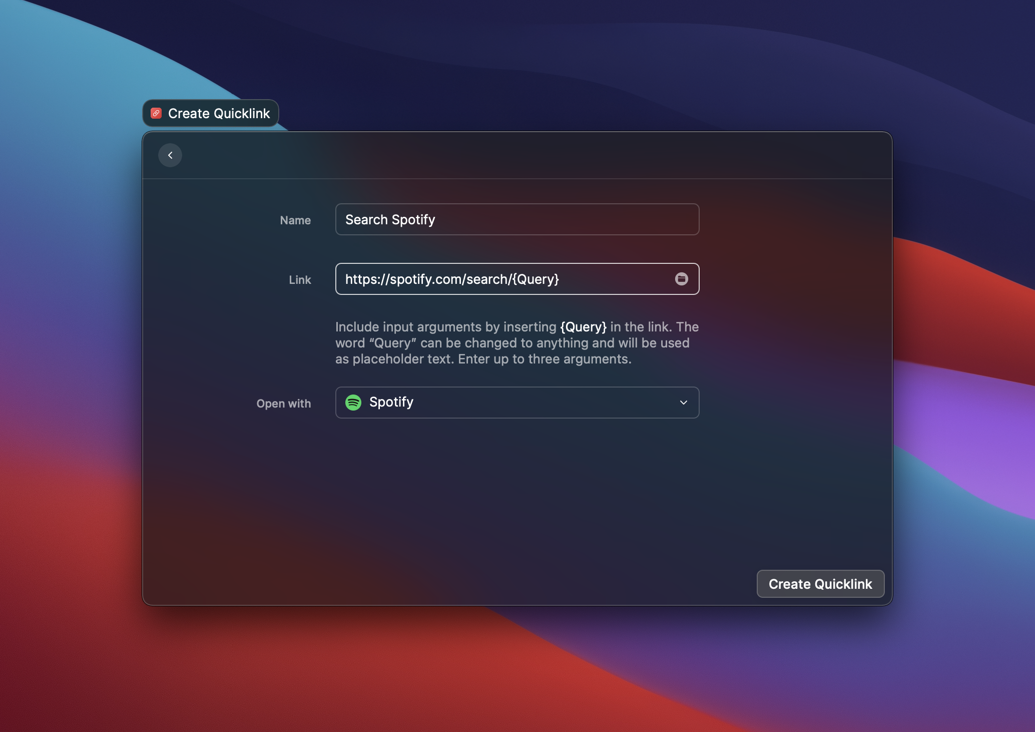 Use the Create Quicklink command to add a new link. Use queries to perform searches on Google, Dribbble, or other websites. Specify an application that the link should open with. All Quicklinks are accessible from within the root search, making it easy to access and customize keyboard shortcuts.