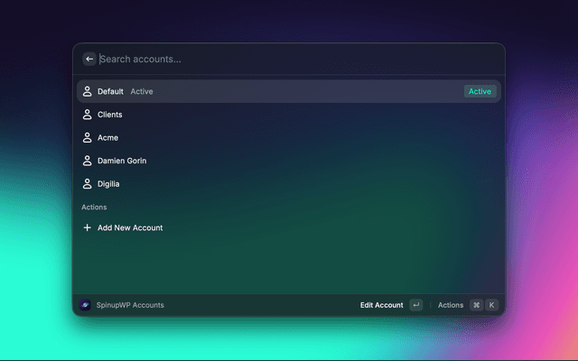 The extension supports managing multiple SpinupWP accounts. Use the SpinupWP Accounts command to: