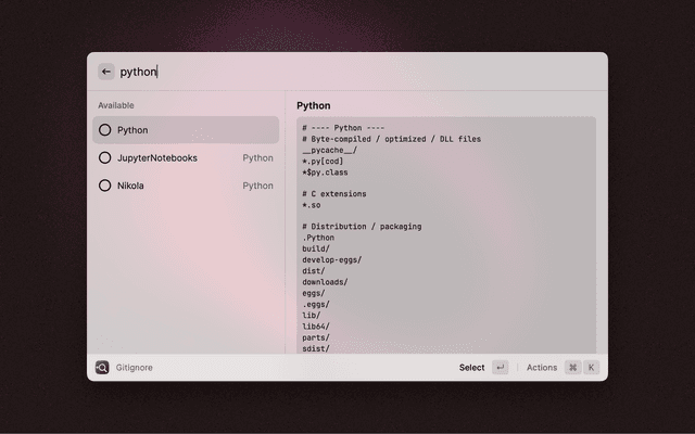 Quickly create a .gitignore file for your project by selecting from hundreds of templates. Supports both macOS and Windows.
