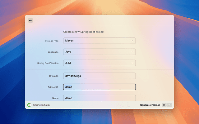 Generate Spring Boot projects directly from Raycast, powered by the official Spring Initializr service.