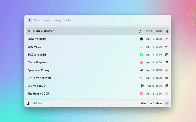Get live and upcoming Counter-Strike 2 (CS2) matches directly from Liquipedia.net – right in Raycast.