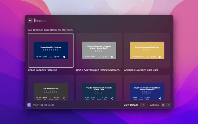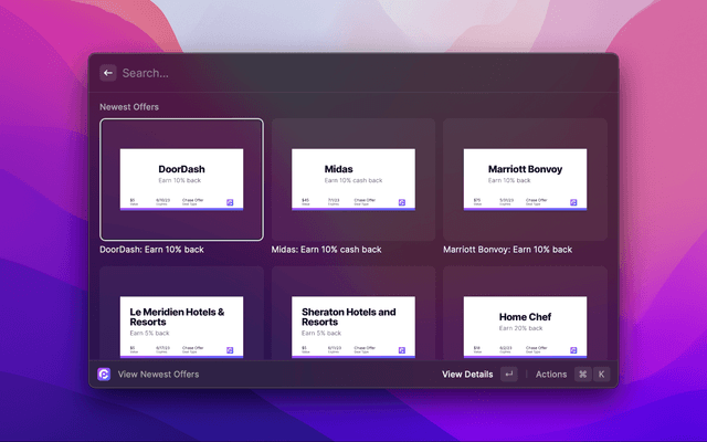 Search for any card or Amex/Chase offer detail, right in Raycast.