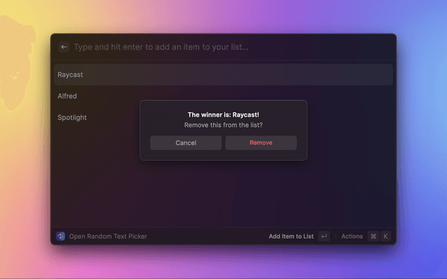 A Raycast extension to pick a random item from a list by entering multiple text inputs, ala Wheel of Names.