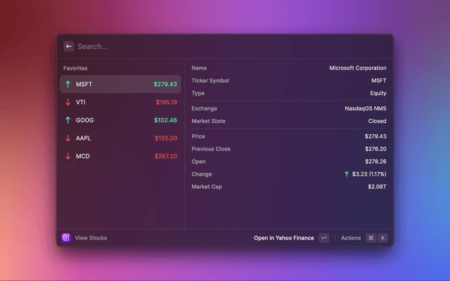 View stock market data in Raycast. Search for individual stocks by name or ticker symbol, and keep track of your portfolio by adding stocks to your list of favorites.