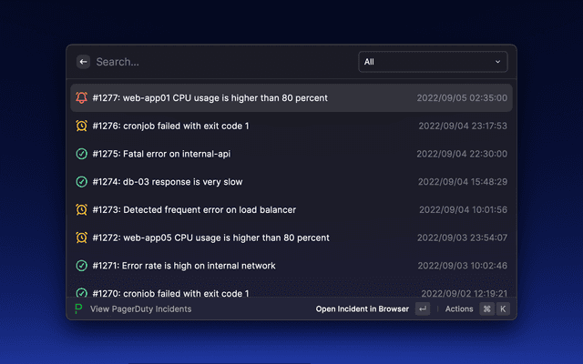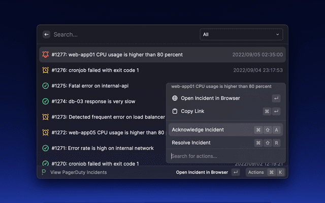 This extension helps you exploring recent PagerDuty incidents and acknowledge/resolve them quickly on Raycast.