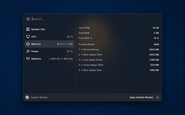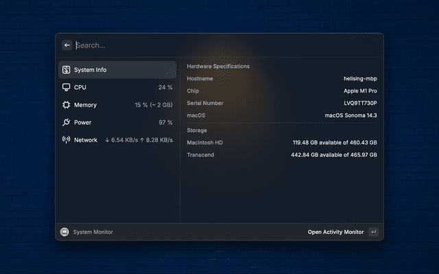 This is a Raycast extension that allows you to monitor your system's CPU, Memory, Disk and Battery usage.