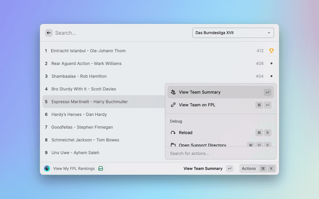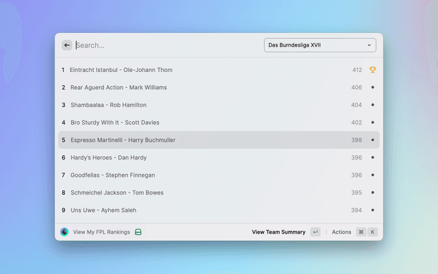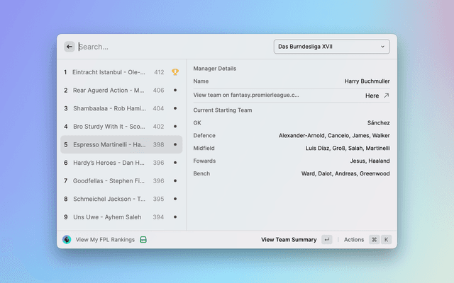 See where you rank amongst in your league rivals in Fantasy Premier League within Raycast.
