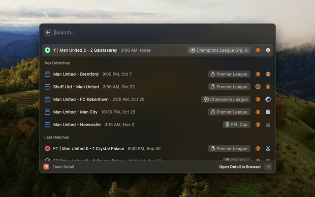 Stay updated with the football world without leaving your workflow. This Raycast extension provides quick access to live scores, match schedules, league tables, team information, and player data from Fotmob's comprehensive football database.