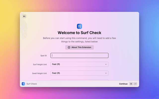 Surf Check is a Raycast extension that provides quick access to surf conditions and forecasts for your nearby surf spots. Using data from Surfline, this extension allows you to check wave heights, wind conditions, water temperature, and more.