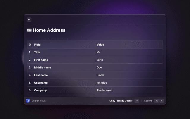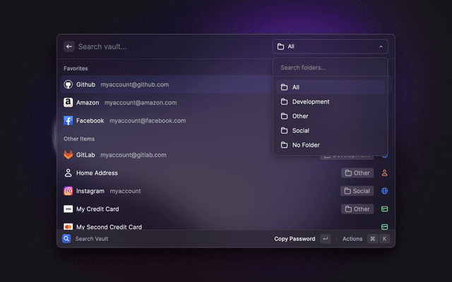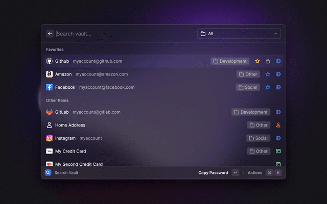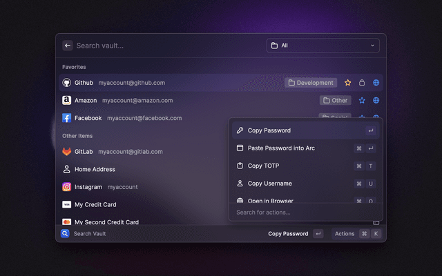 🔎   Search your vault   📋   Copy and paste any field   🔑   Generate passwords and TOTP codes   ⭐   Mark items as favorites