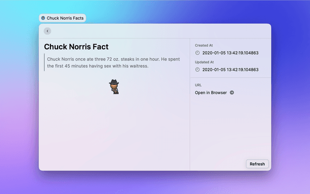 This extension uses the chucknorris.io site which is a free JSON API for hand curated Chuck Norris facts.