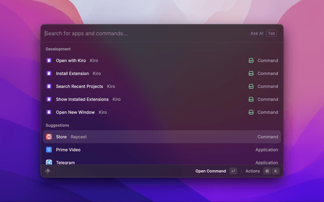 Execute Kiro command palette commands directly from Raycast (requires Raycast for Kiro extension).
