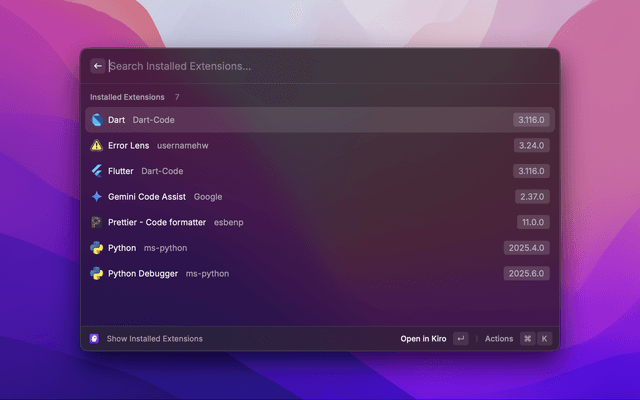 • Manage Extensions: View, install, and uninstall Kiro extensions