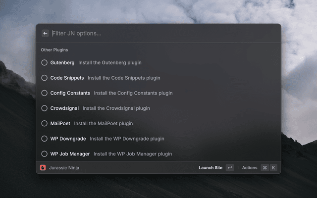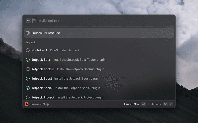• Quick selection of various WordPress plugin options, including Jetpack, Woo, Gutenberg, and more.