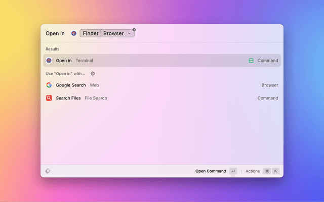 • If the top app is not the Finder, it will automatically detect path or link from selection or clipboard and open it in default app (path in Preferred Terminal, url in browser , email in Mail).