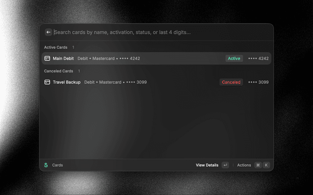 • Cards: inspect cards, lock/unlock card, and update card controls.