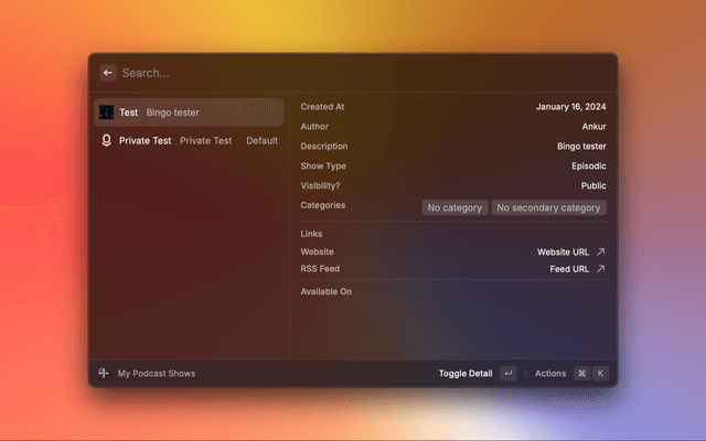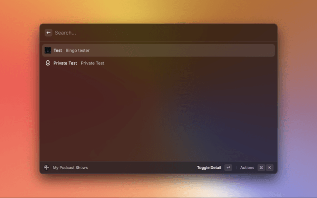 4. Alternatively, if you need to reconfigure the API key, open Raycast extension settings by pressing + + , on your keyboard and paste the API key in the TransistorFM extension preferences.