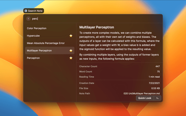 This command will open a random note of a previously selected vault in Quick Look where all actions from the Search Note command are available.