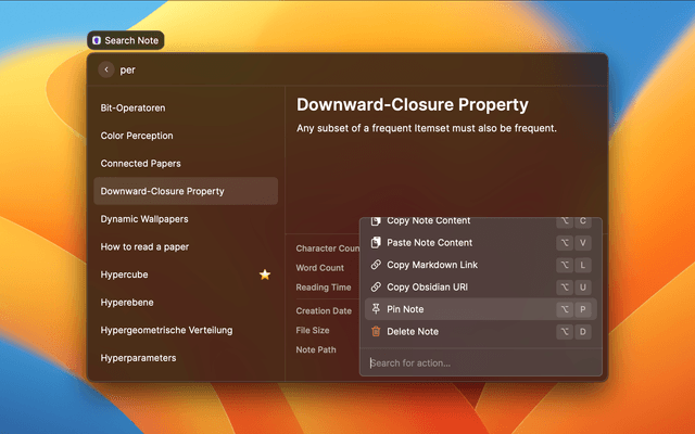 Open Note Actions: Depending on the primary action set in preferences, the keyboard shortcuts can be different.