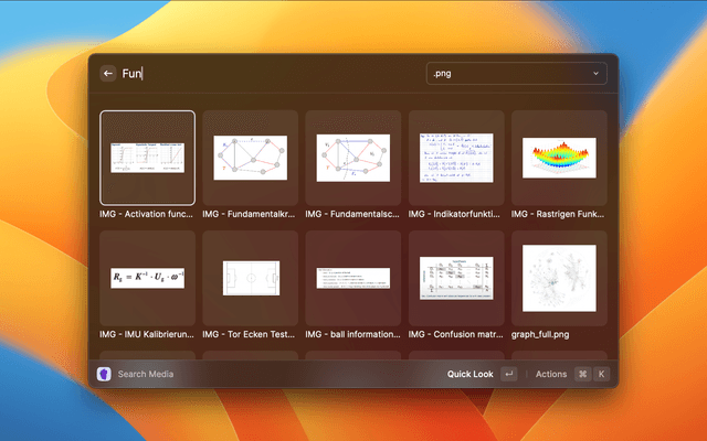 This command allows for quick access to all of the media (images, video, audio and PDFs) in your vaults. Use the type filter in the top right corner (cmd + p) to filter the media by its type / file extension.