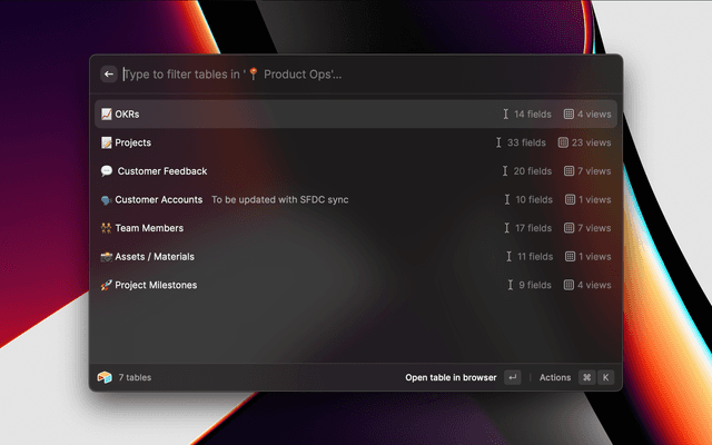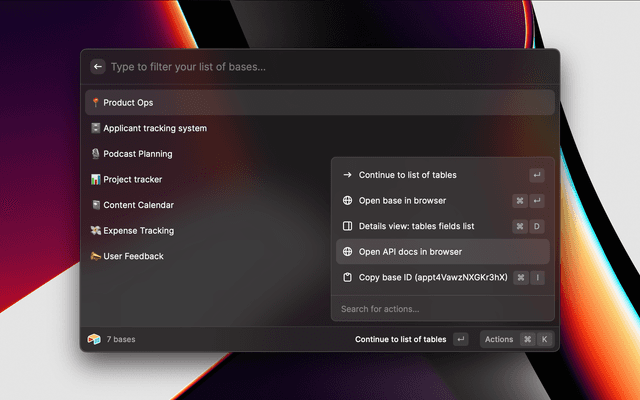 Preview base details including a list of tables, fields, and links to open the base and API docs in your browserPreview base details including a list of tables, fields, and links to open the base and API docs in your browser