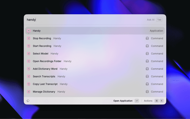 2. In Raycast Preferences → Extensions → Handy, set Handy Binary Path if Handy is not installed at the default location (/Applications/Handy.app/Contents/MacOS/Handy)