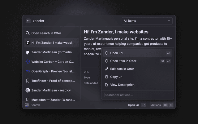 Raycast extension for Otter bookmarks, a self-hosted bookmarking app created by Zander Martineau