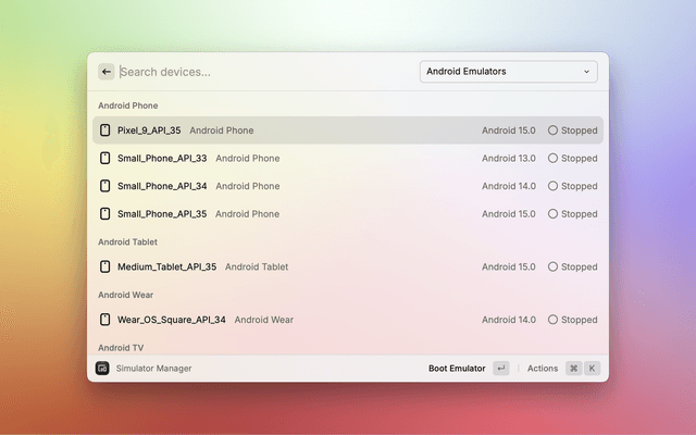 Easily manage iOS simulators and Android emulators directly from Raycast.