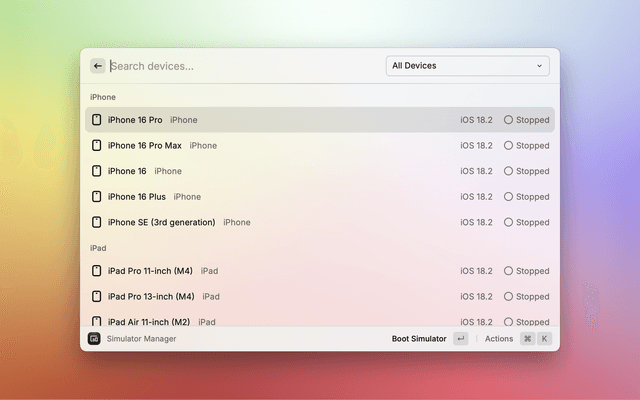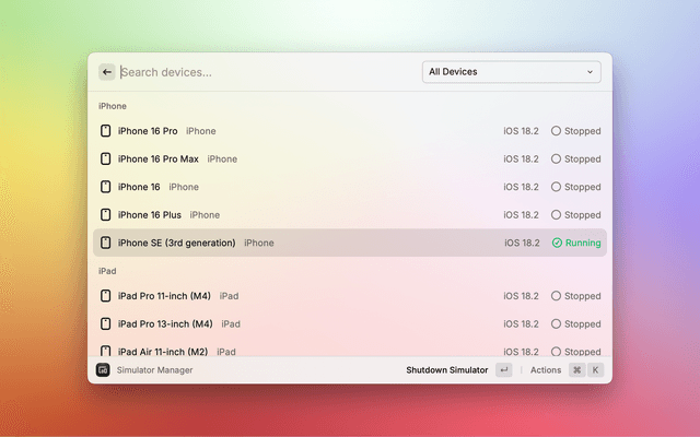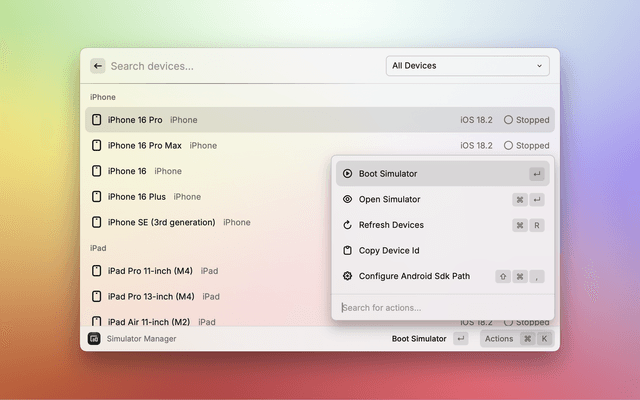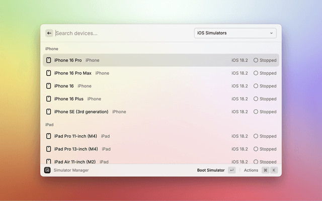 Manage iOS simulators and Android emulators with ease. Boot, shutdown, and open simulators directly from Raycast.