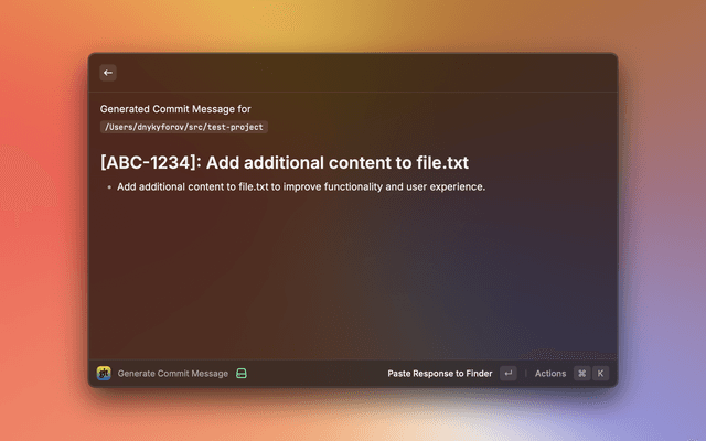 2. Calls an Raycast AI with key context details about current repository branch changes.