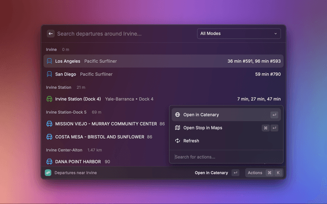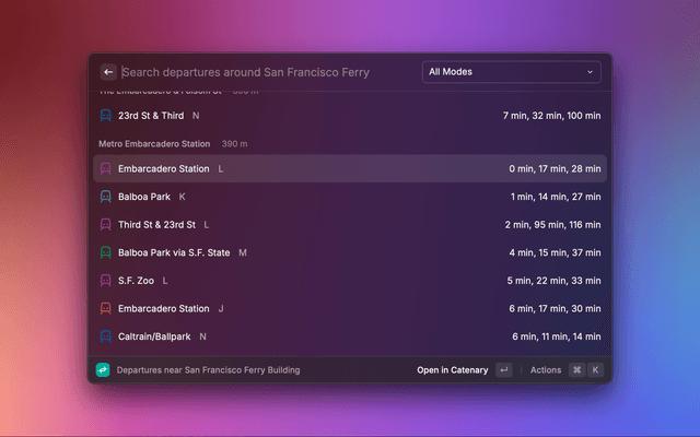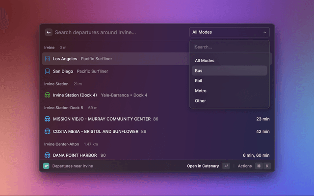 • Filters: Filter departures by mode (Bus, Rail, Metro, etc.).