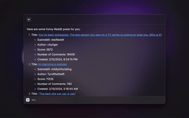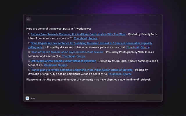 Create a chatbot trained on any website or documentation, and with access to automations. Get answers and trigger actions right in your command bar.