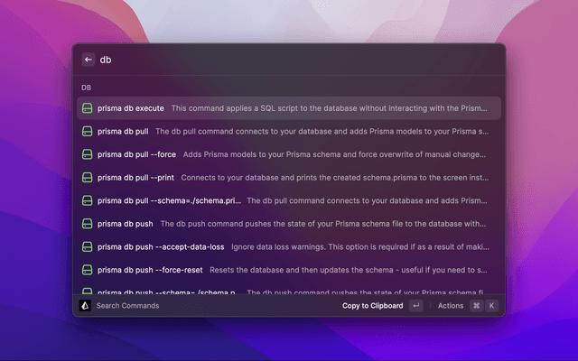 Quickly search and use Prisma CLI Commands along with command details.