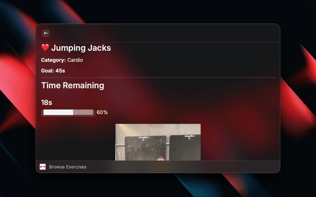 • Sends periodic reminders to exercise (configurable intervals: 30, 45, 60, 90, or 120 minutes)