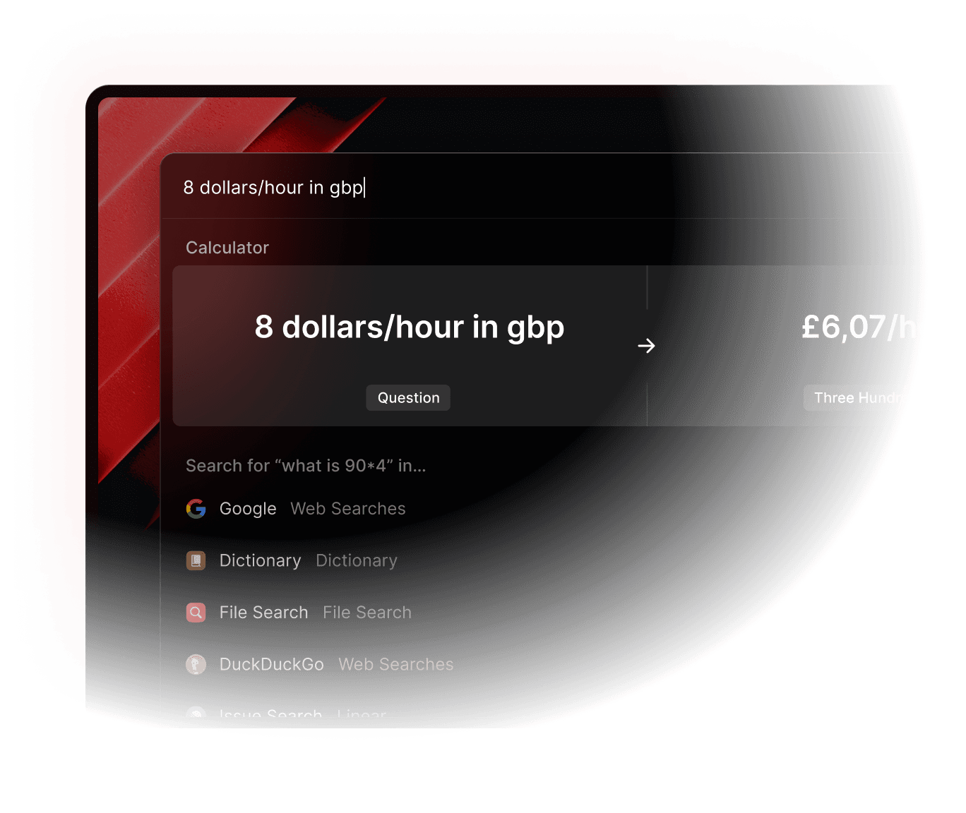 Simply type an expression to solve equations or perform conversions. You can then copy the answer to your clipboard, and carry on with what you were doing before.