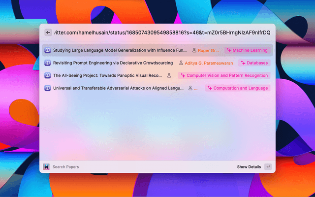 Effortlessly organize your research papers from Arxiv into your Notion database using the Adding a Paper command. This feature: